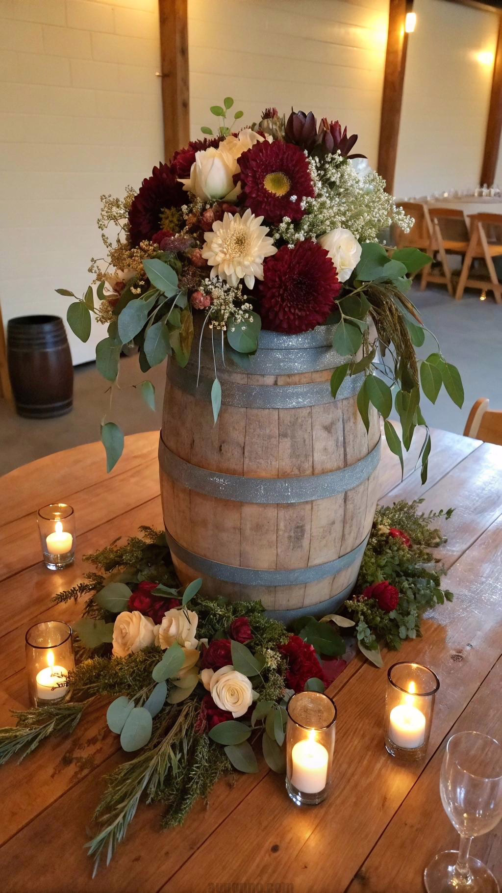 A repurposed wine barrel top makes a stunning rustic wedding centerpiece. The circular shape is perfect for holding a large floral arrangement. Use bold flowers like hydrangeas or dahlias for a dramatic effect.