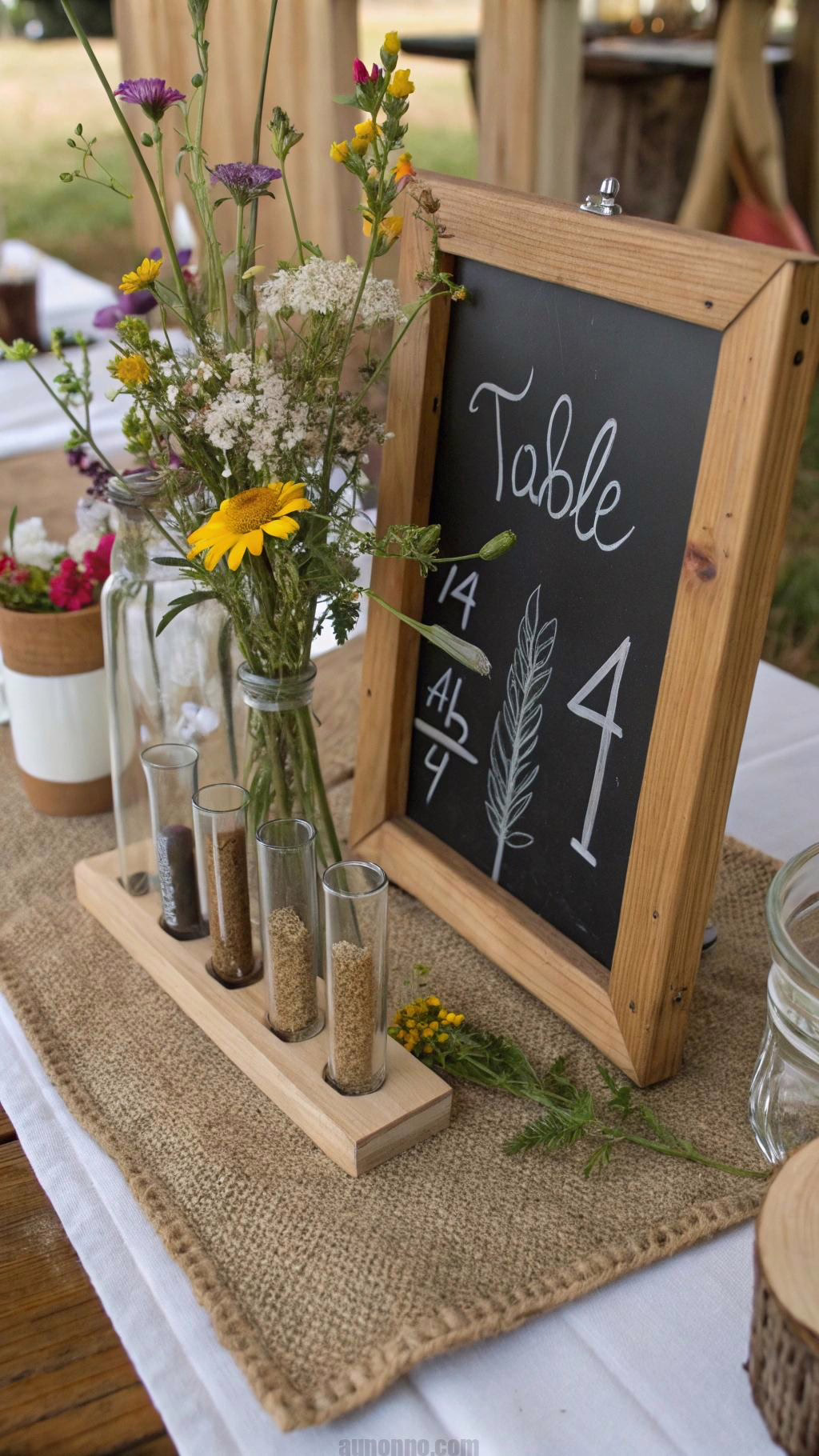 Use a wooden frame for extra rustic appeal. This doubles as both decor and practical signage. Pair it with wildflowers in tiny bottles.