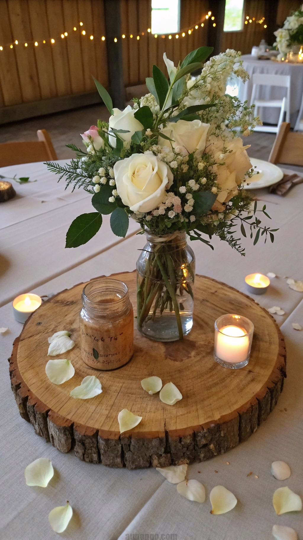 A wood slice floral arrangement is a classic rustic wedding centerpiece. The natural wood base pairs perfectly with fresh blooms for a simple yet elegant look. You can use roses, baby’s breath, or wildflowers for a soft touch.
