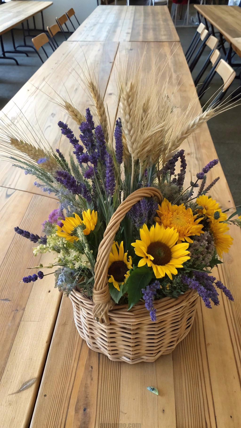 A long, shallow woven basket creates a beautiful floral runner. The natural fibers complement wildflower arrangements perfectly. Use seasonal blooms for the freshest look.