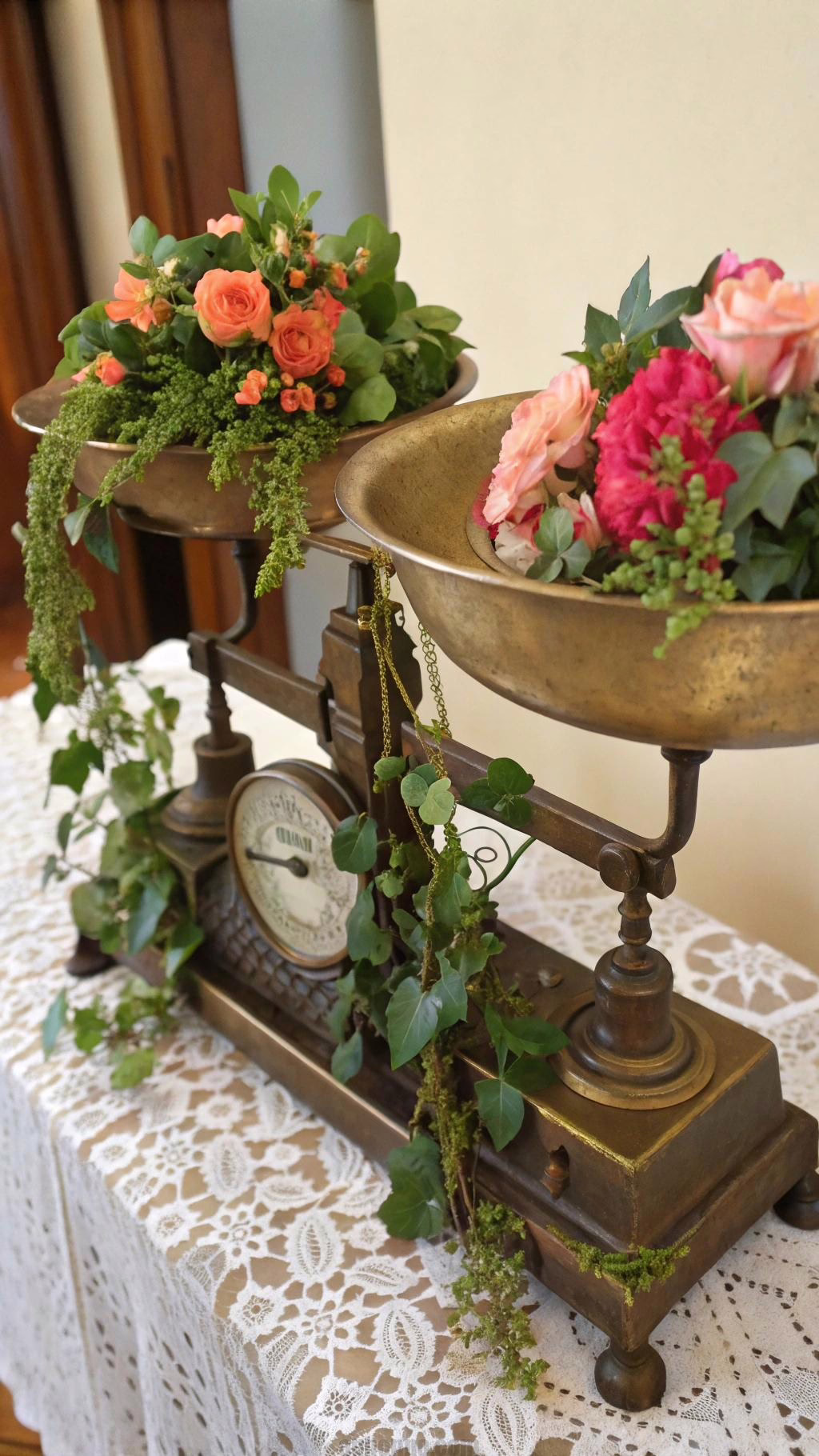 Vintage weighing scales create unique platforms for floral displays. The balanced trays offer perfect symmetry for arrangements. Use wildflowers or hydrangeas to create visual weight on each side.