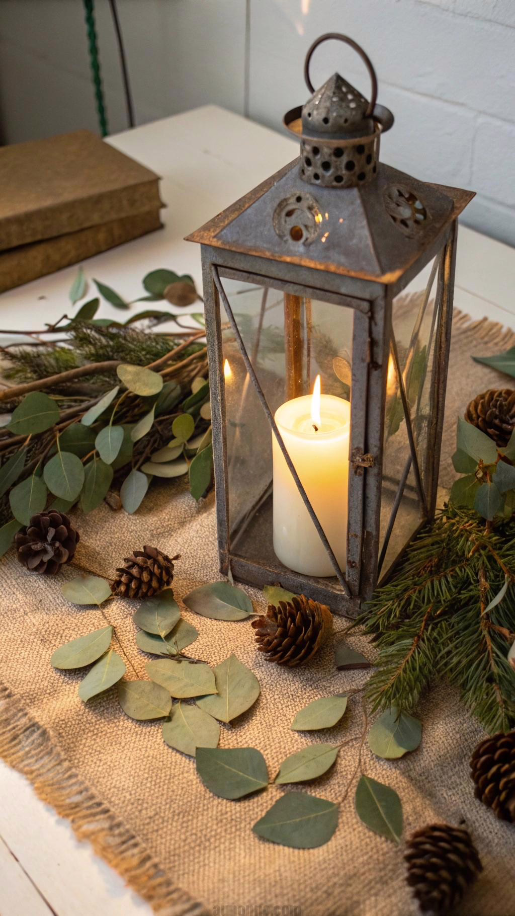 Place a candle inside the lantern for a soft glow during evening receptions. This design works well for both round and long tables. It’s a versatile choice that fits various rustic themes.