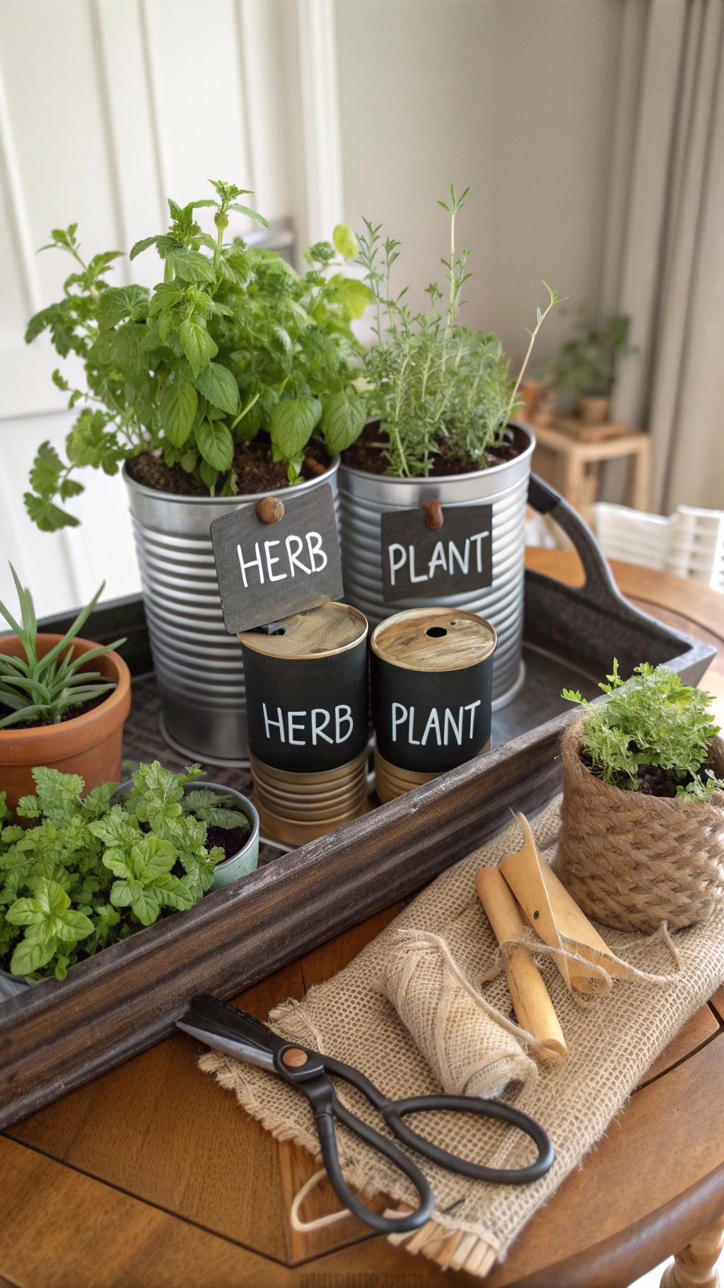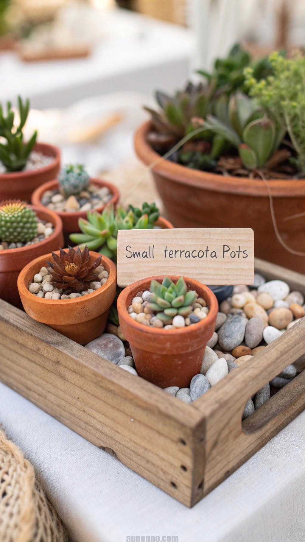 Plant them in tin cans or terra cotta pots for authentic rustic charm. Add chalkboard labels with the herb names. These work beautifully for outdoor garden weddings.
