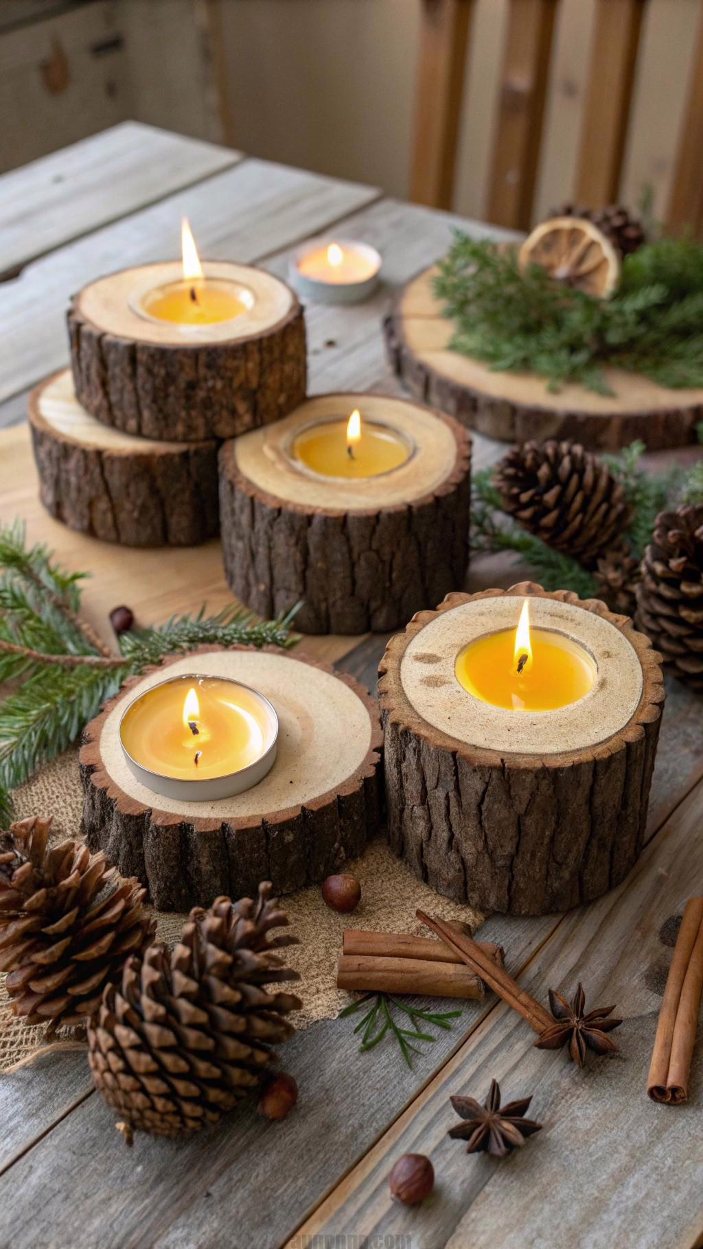 Natural log slices with carved candle holes create simple yet striking centerpieces. The organic wood grain patterns add warmth to tabletops. Use varying diameters for visual diversity.