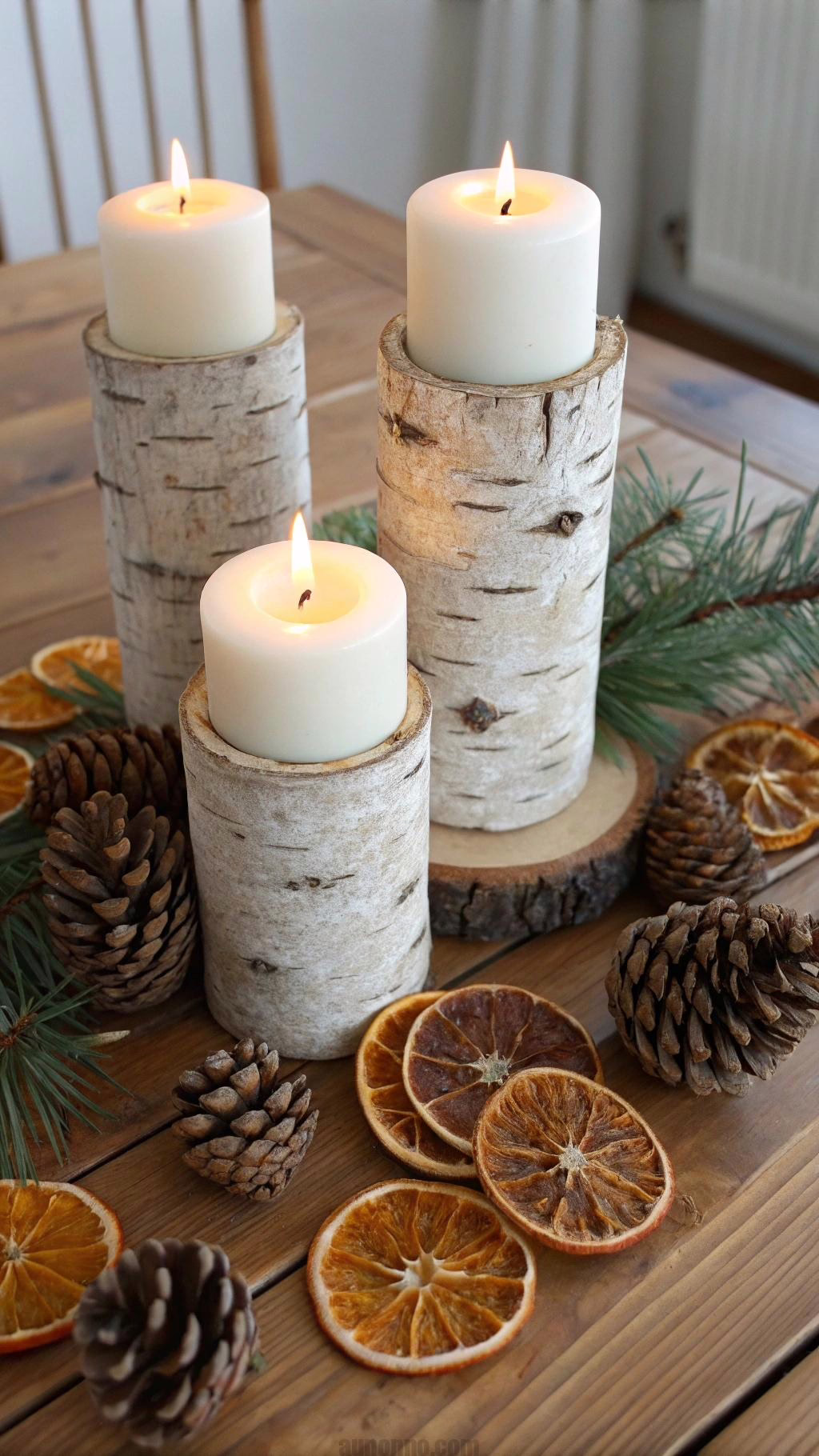 Birch bark-wrapped candle holders bring woodland charm to your tables. The natural texture pairs beautifully with flickering candlelight. Use pillar candles or tea lights for a soft glow.