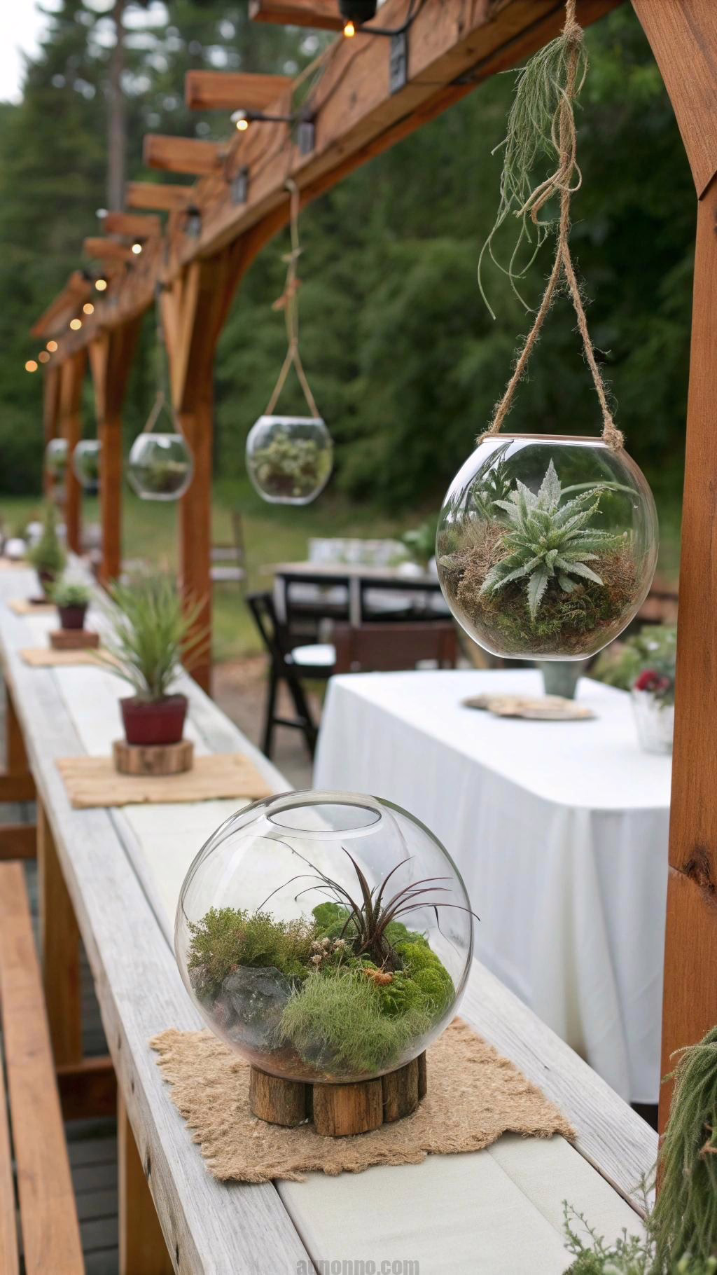Hanging glass terrariums create eye-catching rustic wedding centerpieces. Fill them with air plants, moss, and small succulents for a modern woodland feel. The suspended design keeps tables clutter-free while adding visual interest.