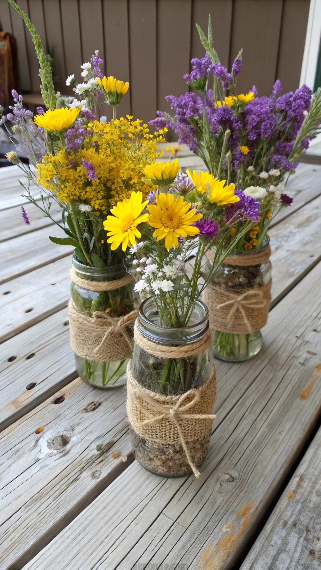 Add twine or lace for extra texture. These vases are easy to customize with different flowers. They’re simple to assemble yet look professionally styled.