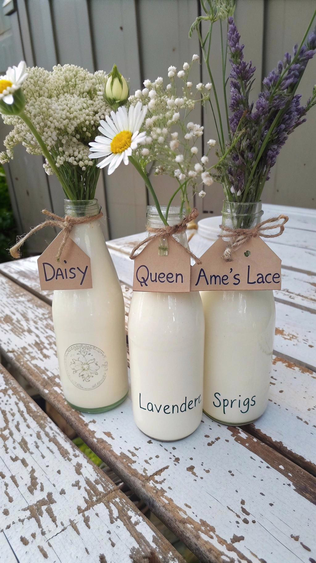 Old milk bottles make delightful rustic vases for wildflower bouquets. Their simple glass design lets the flowers take center stage. Mix different bottle heights for dynamic tablescapes.