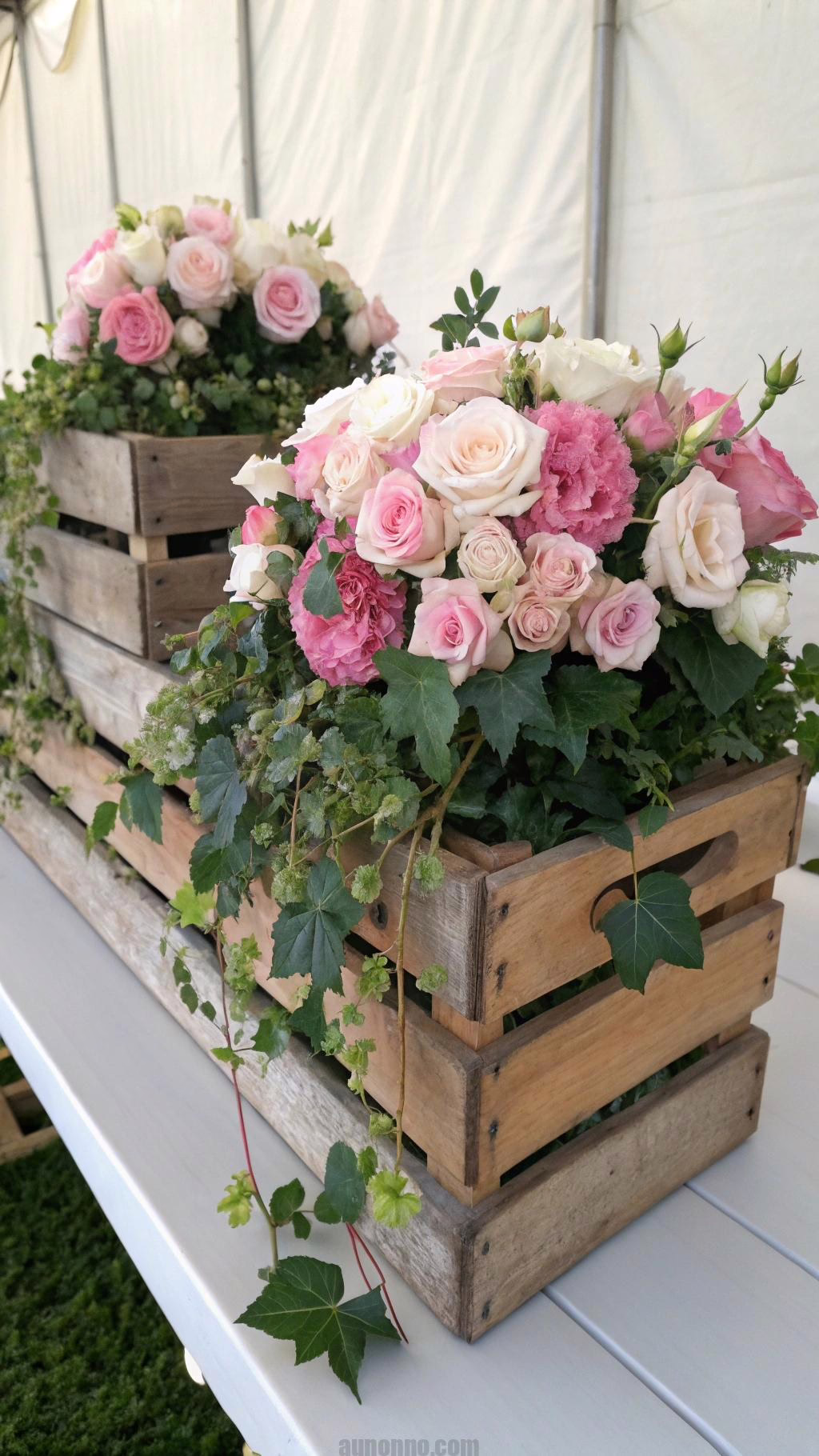 Distress the wood with whitewash for a shabby chic look. Add vintage garden tools as decorative accents. This centerpiece doubles as a unique keepsake after the wedding.