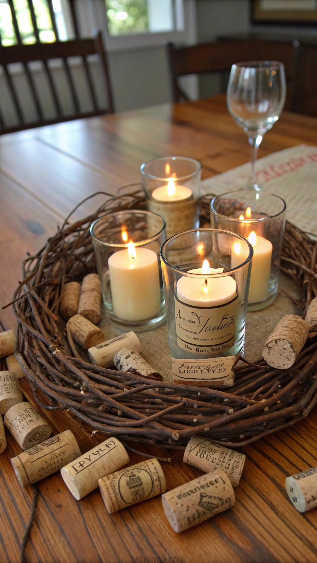 Repurposed wine corks create eco-friendly rustic candle holders. Glue them around glass votives for textured light fixtures. The natural cork pairs perfectly with vineyard weddings.