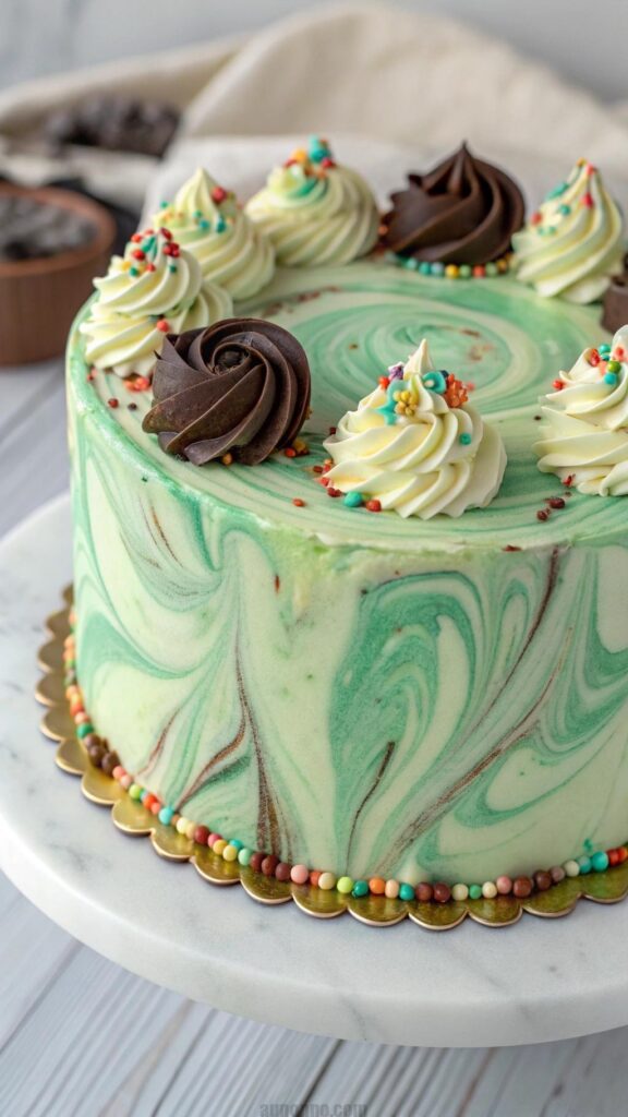 A marble cake combines two colors for a stunning visual effect. For a sage green marble cake, swirl together sage green batter with a classic vanilla or chocolate batter. The result is a beautiful marbled effect that is both eye-catching and delicious. Frost the cake with a simple buttercream and add some decorative elements like chocolate curls or sprinkles.