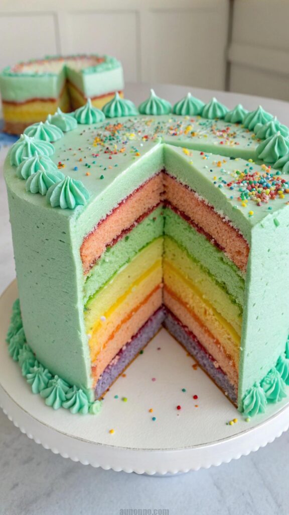 For a fun and colorful twist, consider a sage green rainbow cake. Create multiple layers of cake in different colors, with sage green as one of the layers. When sliced, the cake reveals a vibrant rainbow effect. Frost the outside with sage green buttercream and decorate with sprinkles or edible glitter for a festive touch.