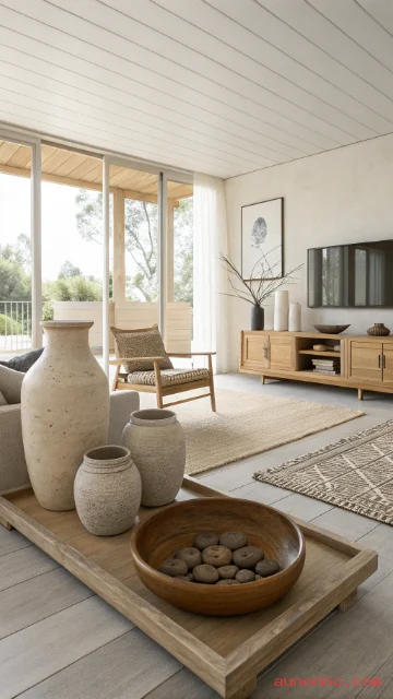 Use fewer decor items, but choose them well. Focus on natural materials like ceramic and wood. Leave empty space so the room feels airy.