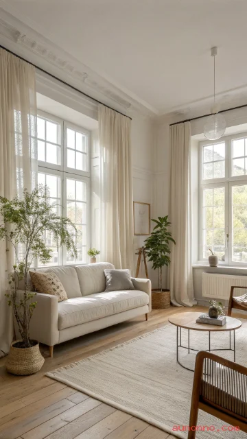 Choose white or warm beige curtains. Hang them high to make the ceiling feel taller. Let them touch the floor for a relaxed look.