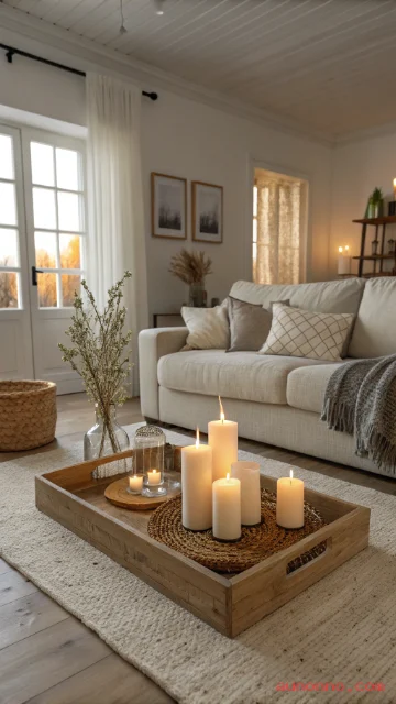 Candles make a room feel calm and welcoming. Place them in simple holders on a tray or side table. Choose unscented candles if you want a clean feel.