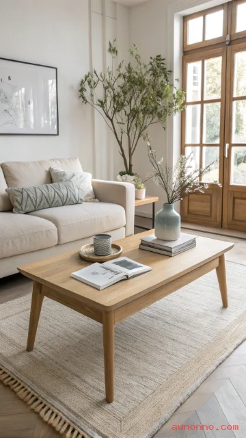 Wood furniture adds warmth to a bright room. Pick a coffee table with clean legs and a smooth top. Light oak or ash fits the Scandinavian vibe.