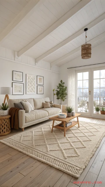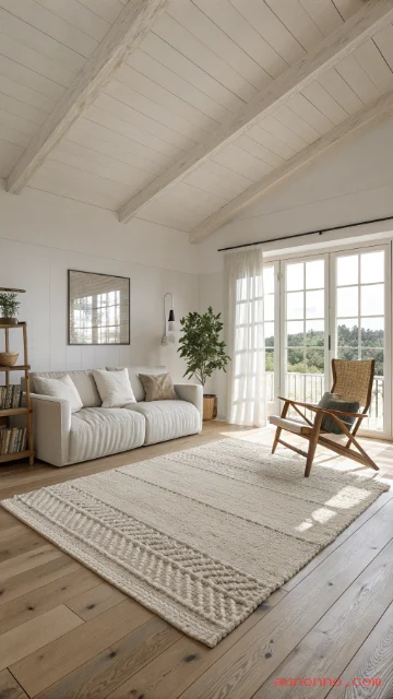 A rug makes the space feel finished. Choose a low-pattern rug with texture like wool or looped weave. Keep it light so the room stays airy.