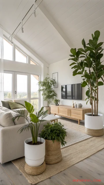 Keep plant sizes balanced with the room scale. One taller plant can anchor a corner. Add one small plant on a shelf for rhythm.