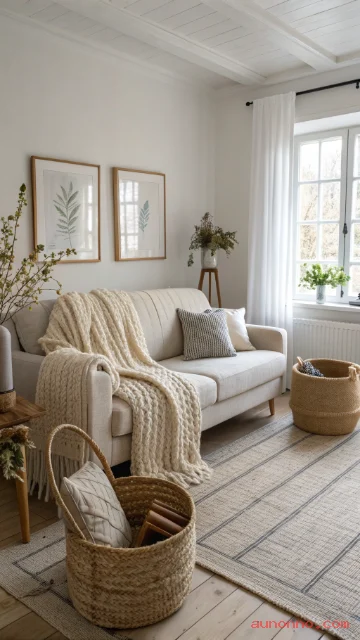 Use layered textures like wool, linen, and knit throws. Add warm lighting with lamps and candles. Keep clutter hidden so the room stays calm.