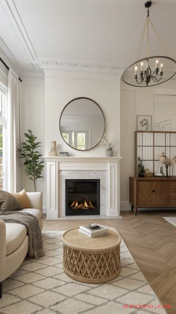 A fireplace creates a natural focal point. If you do not have one, style the wall like a hearth zone. Use a simple mantel shelf and calm decor.