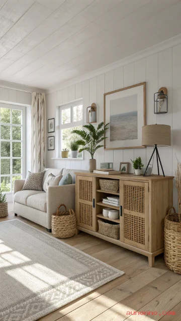 Pick storage in light wood or matte white. Hide cables and small items inside. Keep one basket for throws near the sofa.