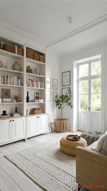 Scandinavian design loves practical storage. Use baskets, closed cabinets, and sideboards with simple fronts. This keeps the room calm even on busy days.