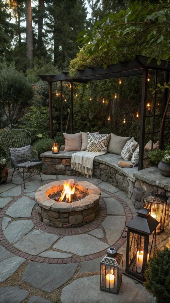 Add a few blankets and lanterns for a rustic touch. A fire pit makes your garden usable year-round. It’s perfect for evening relaxation or entertaining guests.