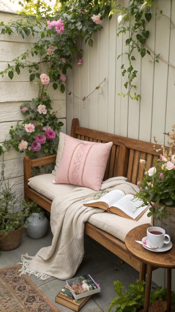 Add soft cushions, a throw blanket, and a small side table for comfort. This cozy spot becomes the perfect place to relax, read, or enjoy a cup of tea. A seating nook transforms your garden into a personal sanctuary.