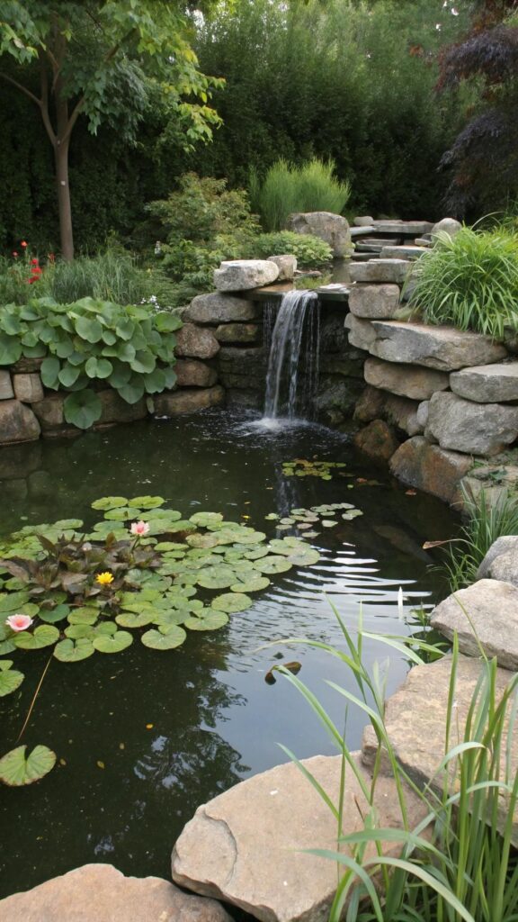 A garden pond creates a serene focal point. Use stones or plants to edge the pond. Add water lilies or fish for extra interest.