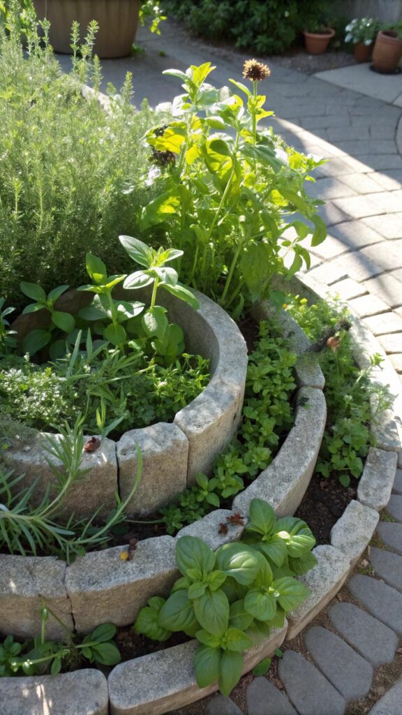 A herb spiral is a compact, vertical way to grow herbs. Use stones or bricks to build a spiral shape. Plant herbs like basil, thyme, and rosemary at different levels.