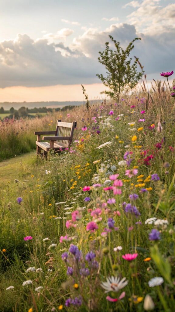 Add a small bench or stepping stones to enjoy the view. A wildflower meadow attracts bees and butterflies. It’s a beautiful way to support local wildlife.