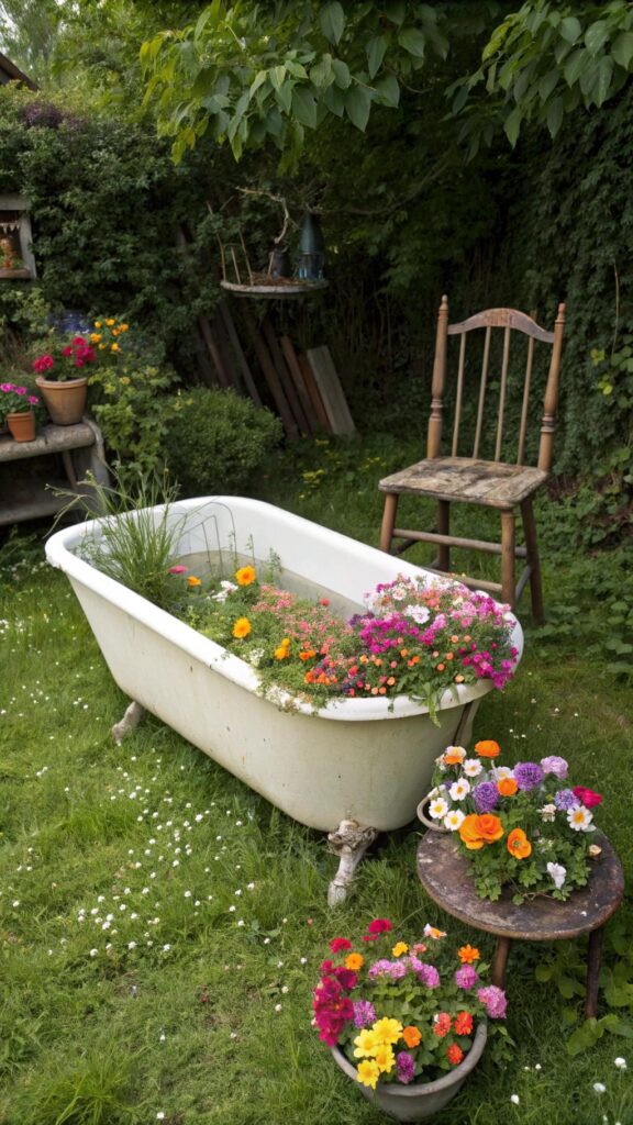 Repurpose old furniture like chairs, dressers, or bathtubs as unique planters. Fill them with soil and plant flowers or herbs. This adds a quirky, creative touch to your garden.