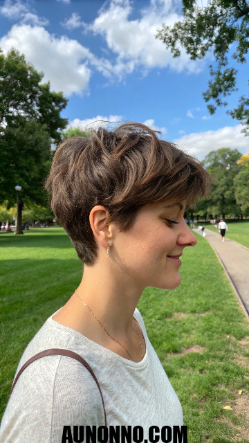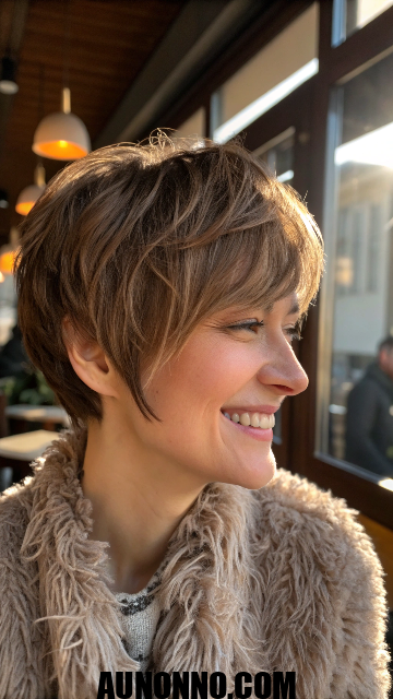 This version is the perfect transition into shorter hair. It keeps more length around the nape and sides than a traditional pixie. The top layers are shaggy and textured for modern appeal. You can still tuck hair behind your ears for versatility. It offers a softer, more forgiving take on the short hair trend. This cut is ideal for those who are pixie-curious.