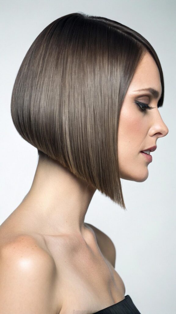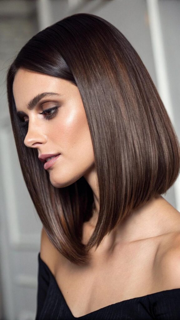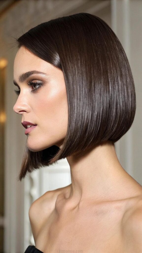 A sleek bob with a side part is a classic and elegant hairstyle for brunettes. This cut features smooth, straight hair with a deep side part, creating a polished and sophisticated look. It’s perfect for formal events or professional settings.