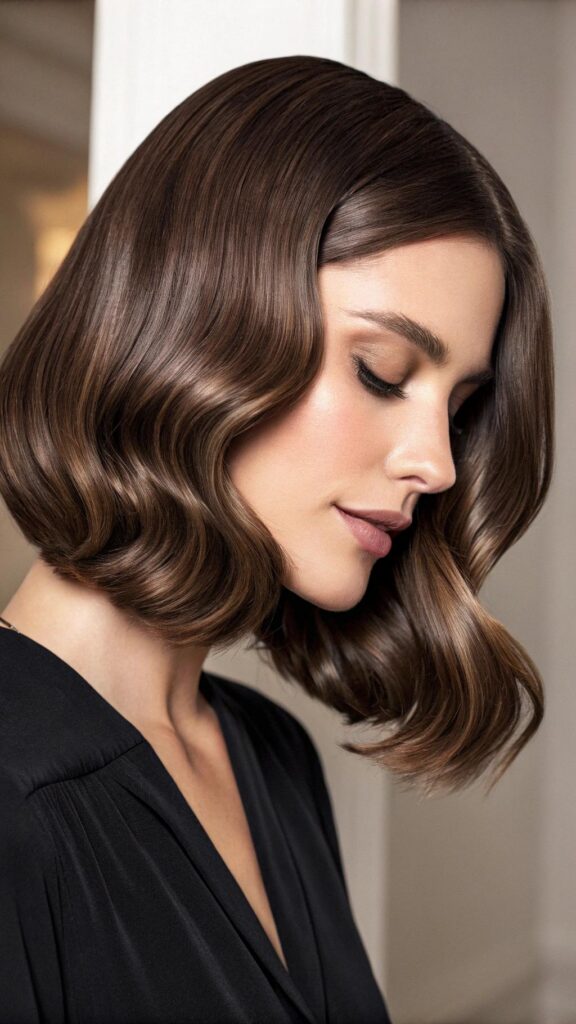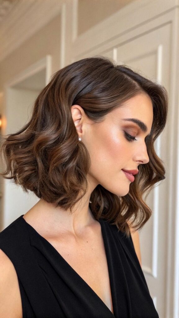 A wavy bob with a side part is a classic and elegant hairstyle for brunettes. This cut features soft waves and a deep side part, creating a polished and sophisticated look. It’s perfect for formal events or professional settings.
