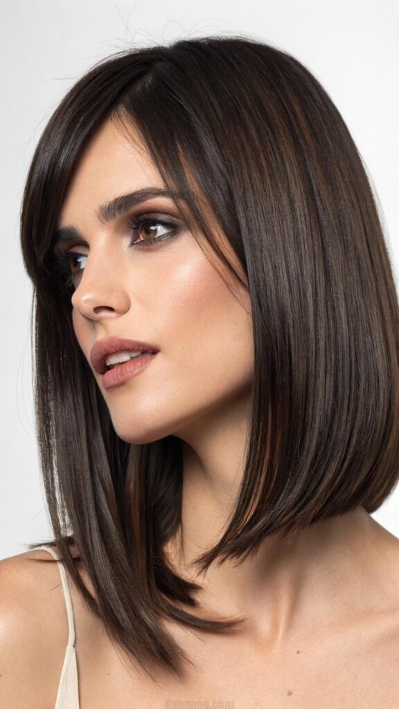 A sleek lob with a deep side part is a classic and elegant hairstyle for brunettes. This cut features smooth, straight hair with a dramatic side part, creating a polished and sophisticated look. It’s perfect for formal events or professional settings.