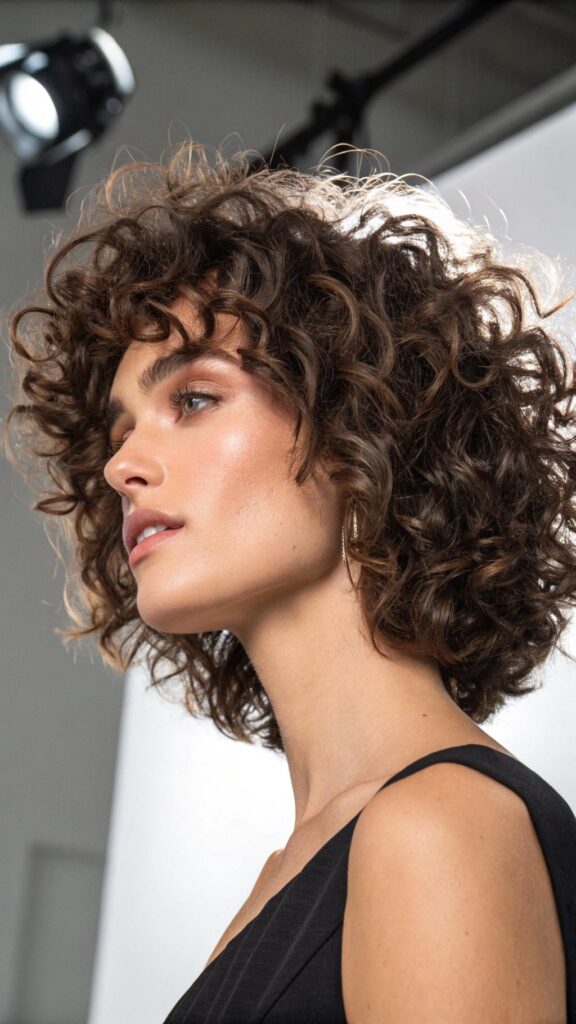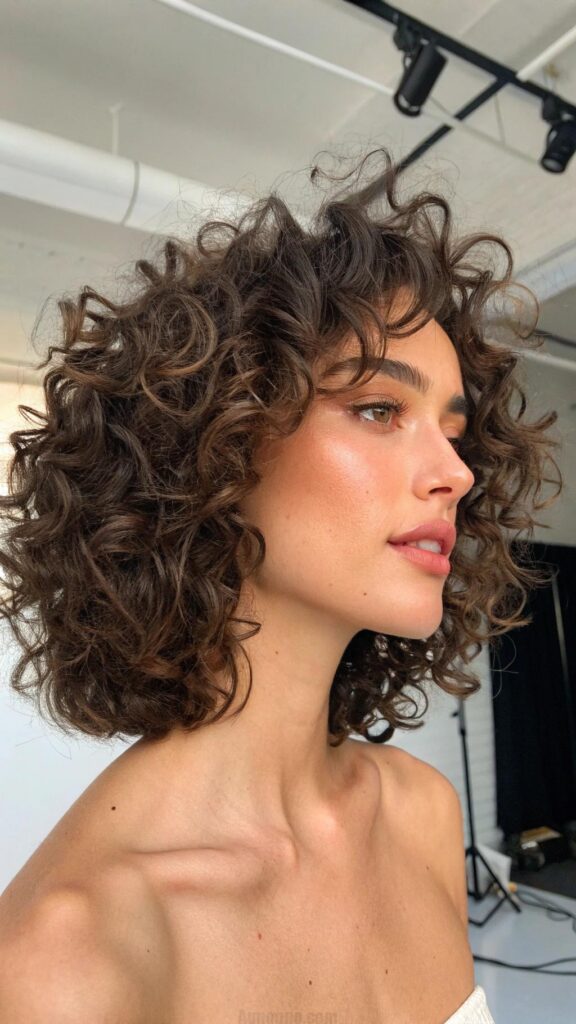 A curly bob with defined ringlets is a stunning and voluminous hairstyle for brunettes. This cut features bouncy, well-defined curls that showcase your natural texture. It’s perfect for those who want a bold and eye-catching look.