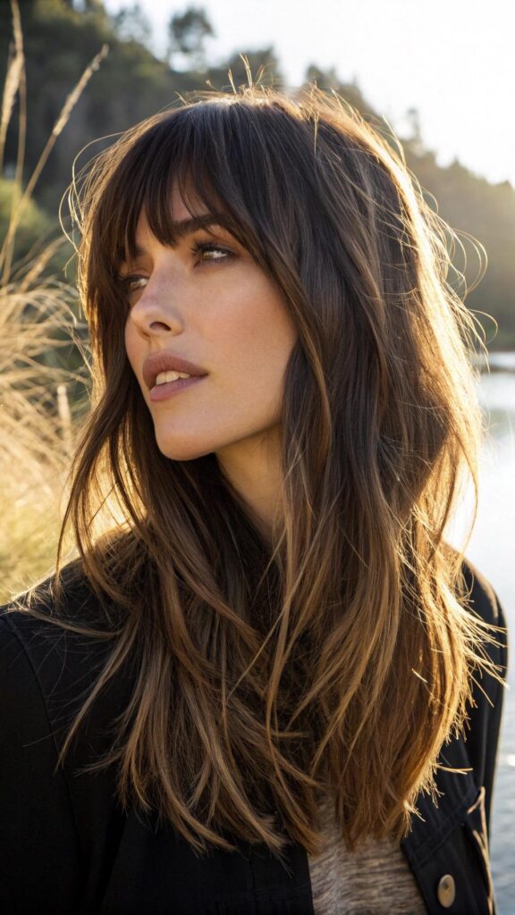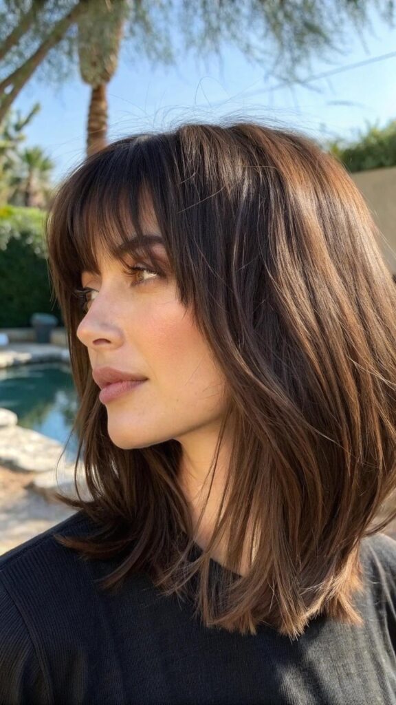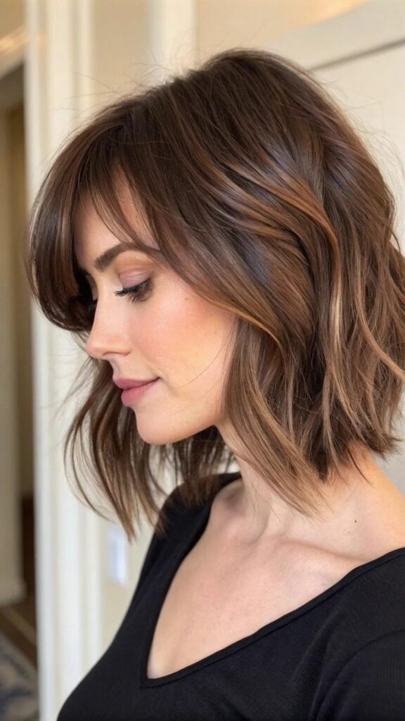 A layered bob with side-swept bangs is a trendy and flattering hairstyle for brunettes. This cut features soft layers and bangs that sweep to one side, creating a polished and sophisticated look. It’s perfect for those who want a stylish yet low-maintenance style.