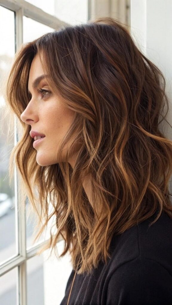 The wavy lob, or long bob, is a flattering and modern choice for brunettes. This hairstyle features soft waves that add volume and texture to the hair. Adding highlights can enhance the dimension and depth of the brown tones.