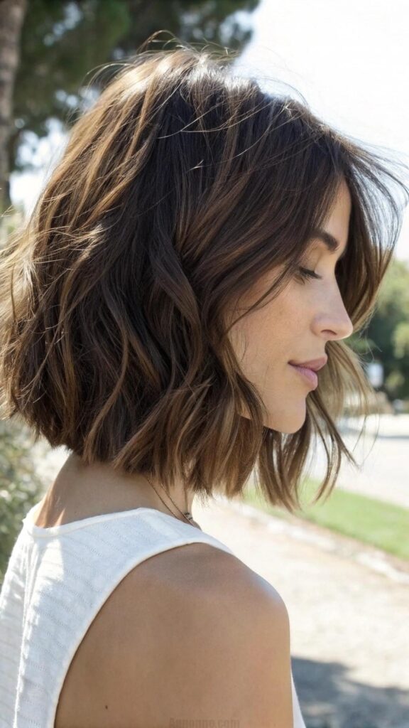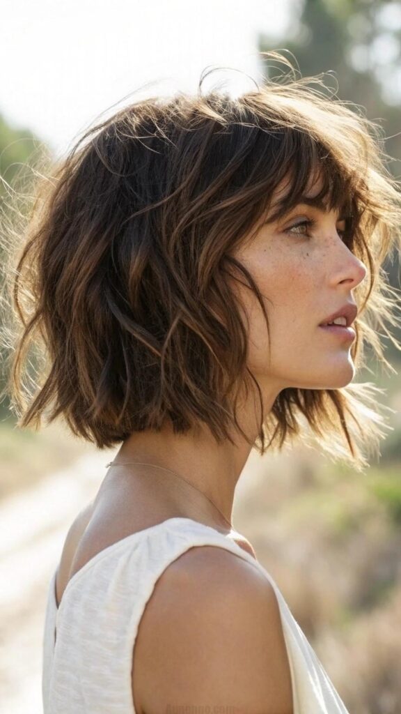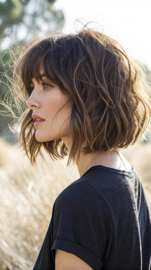 A textured bob with wispy ends is a relaxed and stylish hairstyle for brunettes. This cut features choppy layers and soft, wispy ends that create a carefree and effortless look. It’s perfect for those who want a low-maintenance yet trendy style.