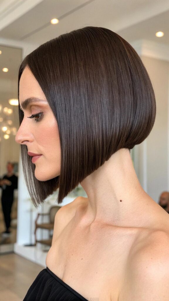 A sleek bob with angled ends is a chic and modern hairstyle for brunettes. This cut features a sharp, angled shape that creates a dramatic and edgy look. It’s perfect for those who want a bold and sophisticated style.