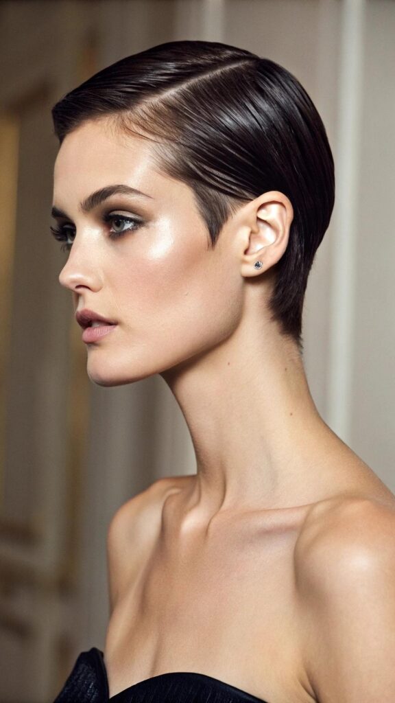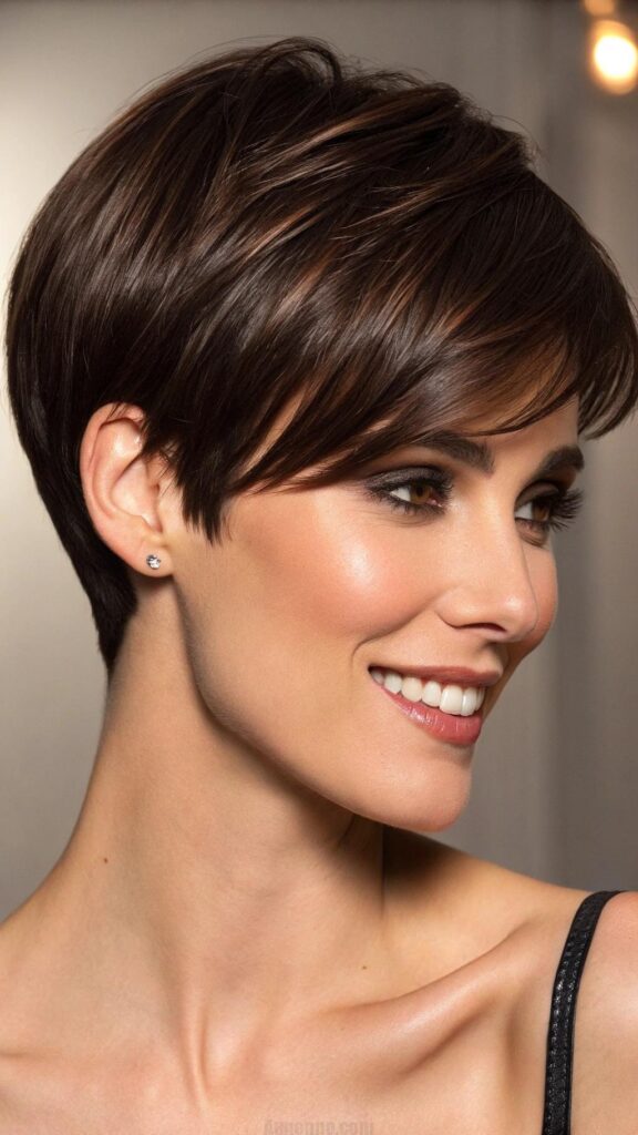 A sleek pixie with a side part is a classic and elegant hairstyle for brunettes. This cut features smooth, straight hair with a deep side part, creating a polished and sophisticated look. It’s perfect for formal events or professional settings.