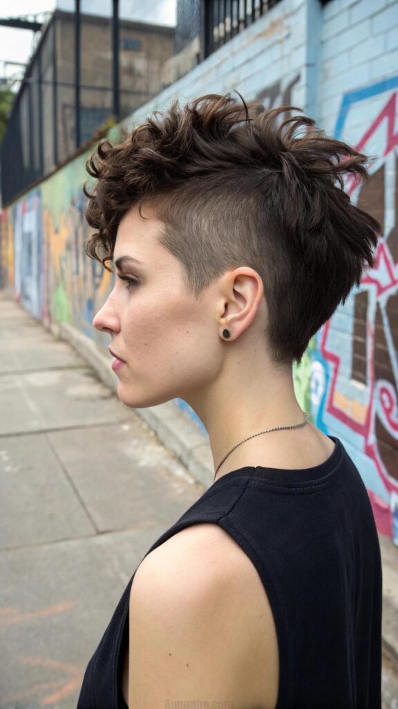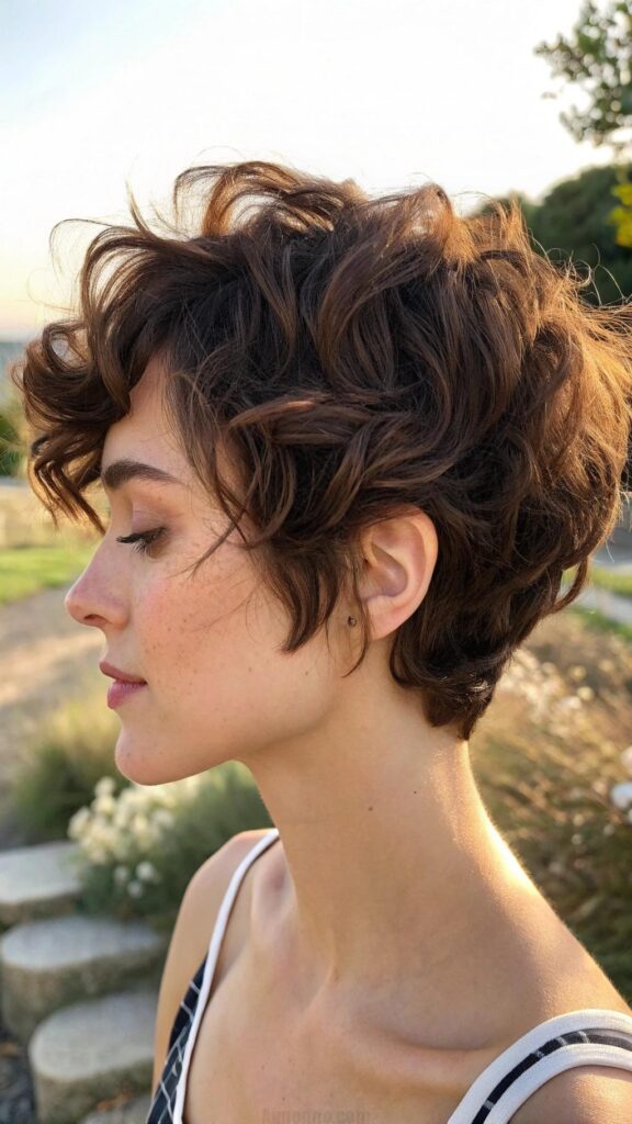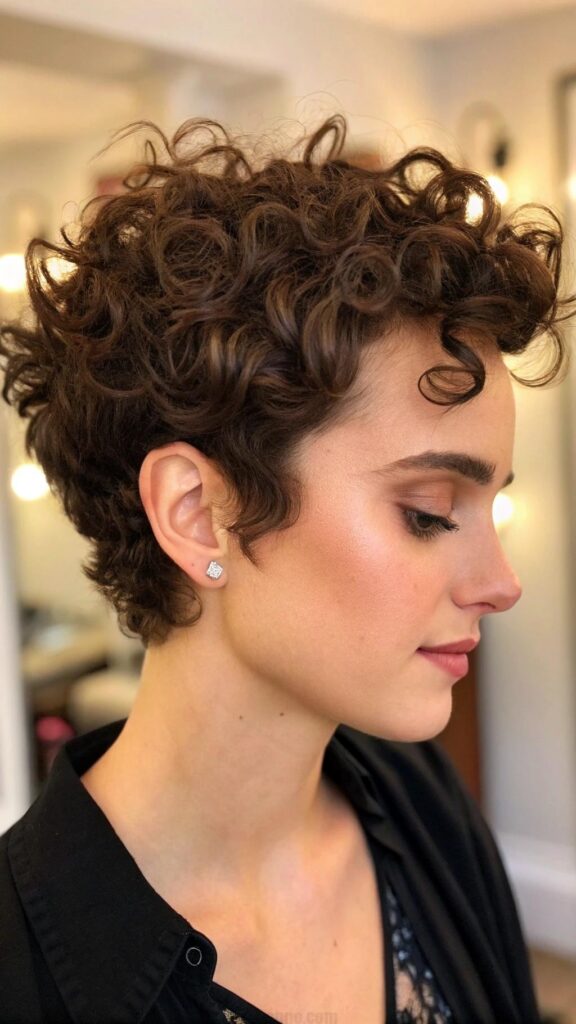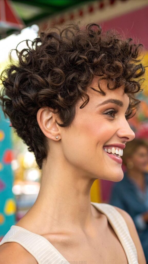 A curly pixie with a side part is a fun and flirty hairstyle for brunettes. This cut features bouncy curls and a deep side part, creating a playful and dynamic look. It’s perfect for those who want a short hairstyle with a touch of softness.