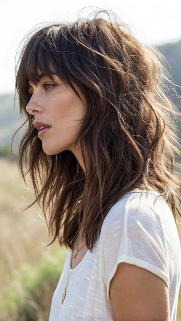 A tousled shag with bangs is a trendy and relaxed hairstyle for brunettes. This cut features choppy layers and textured ends, creating a messy, undone look. The bangs add a touch of softness and frame the face beautifully.