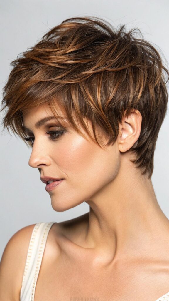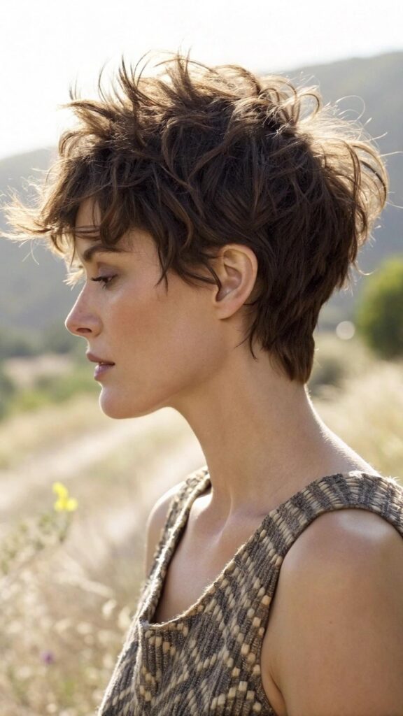 A textured pixie with tousled layers is a fun and playful hairstyle for brunettes. This cut features choppy layers and messy ends, creating a carefree and relaxed look. It’s perfect for those who want a low-maintenance yet stylish hairstyle.