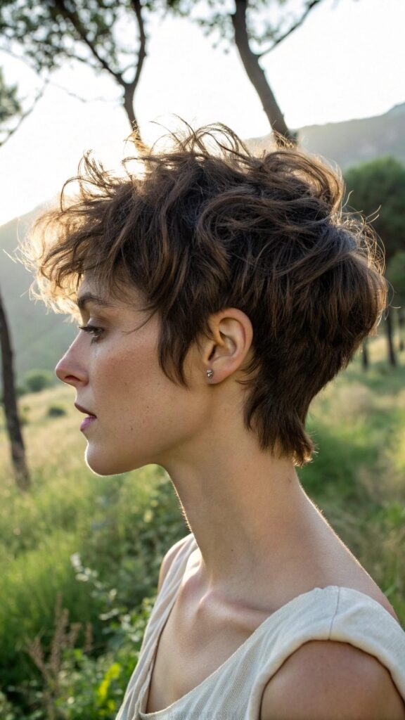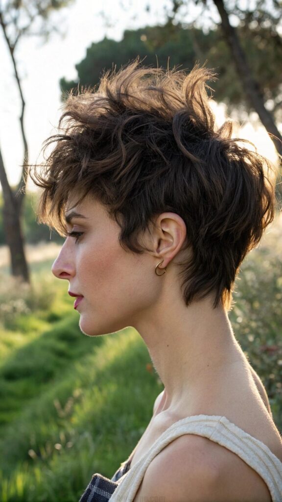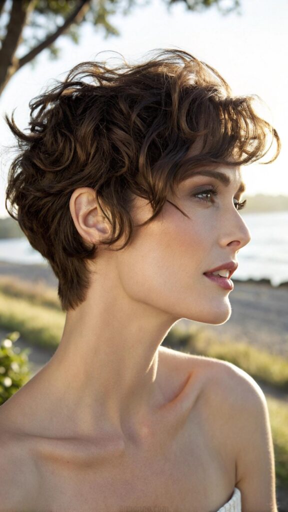 A wavy pixie with side-swept bangs is a playful and feminine hairstyle for brunettes. This cut features soft waves and bangs that sweep to one side, creating a flirty and dynamic look. It’s perfect for those who want a short hairstyle with a touch of softness.