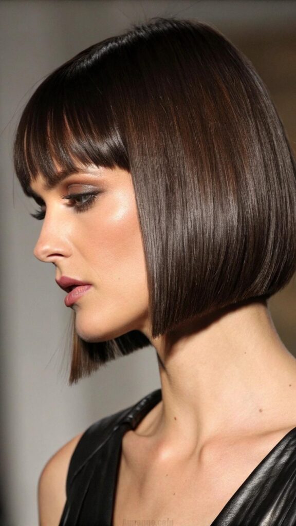 A sleek bob with blunt bangs is a striking and sophisticated hairstyle for brunettes. This cut features straight, smooth hair with sharp, even bangs that create a bold and polished look. It’s perfect for those who want a minimalist yet impactful style.
