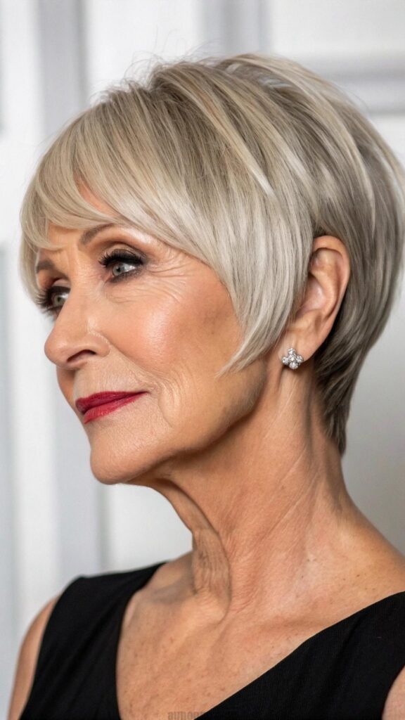 Side-swept bangs are a great addition to any short hairstyle. They soften the face and add a touch of sophistication. This style is perfect for women over 70 who want to frame their features.