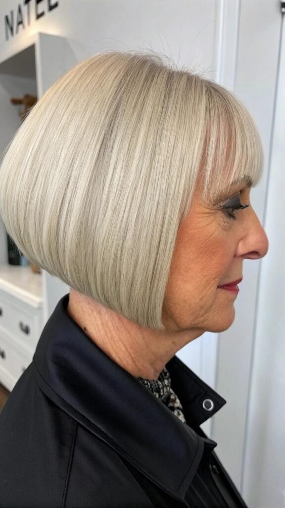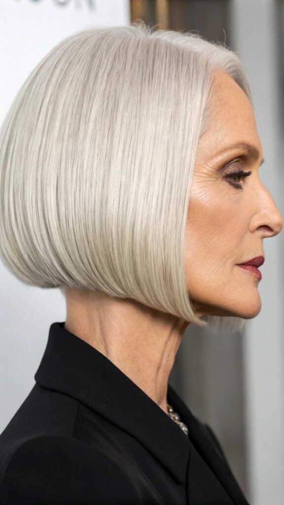 The sleek bob is a polished and sophisticated hairstyle for women over 70. It’s straight, smooth, and perfect for those who prefer a clean and elegant look. This style works well with all face shapes.