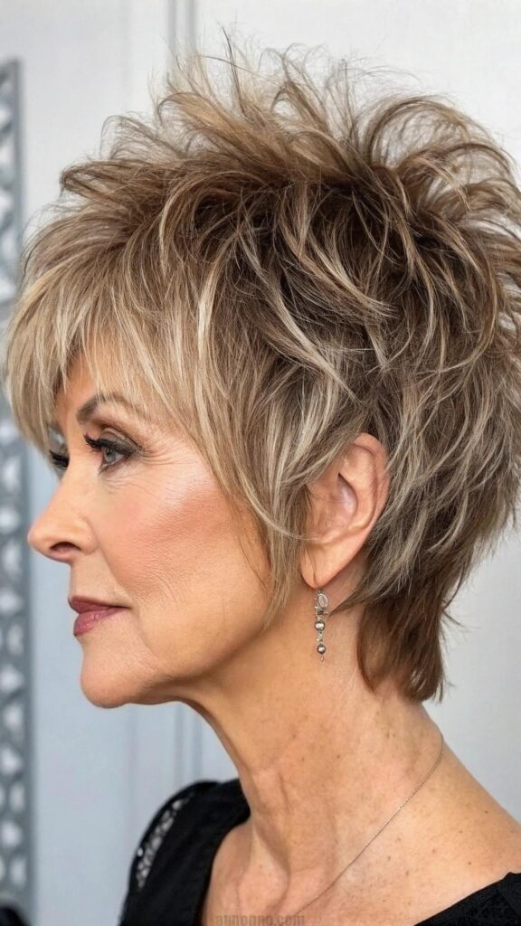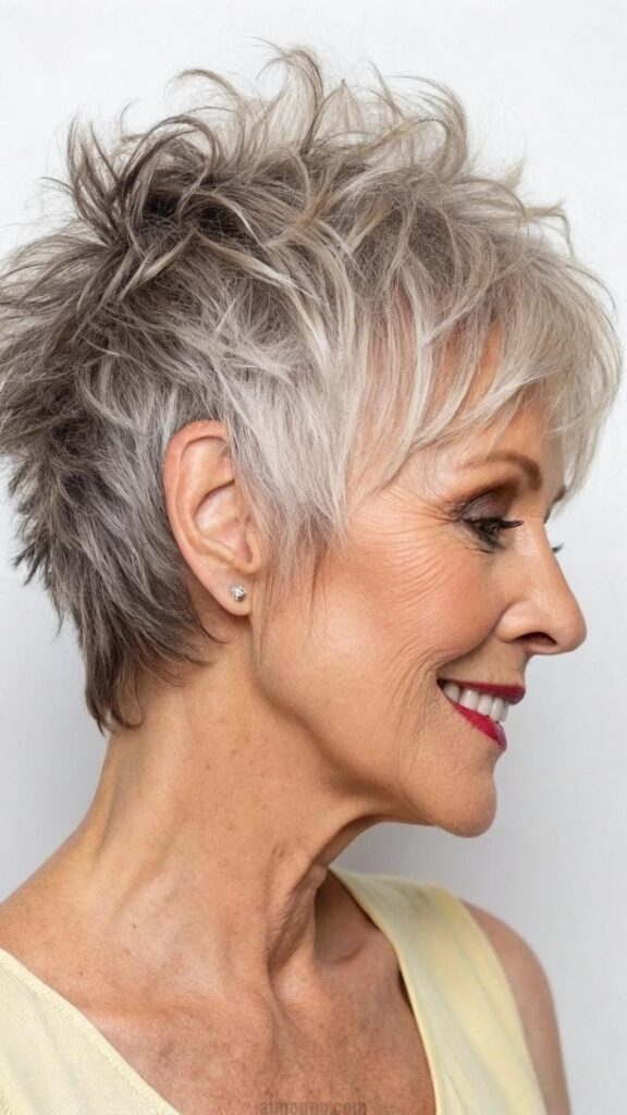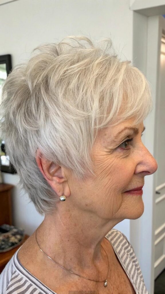 The shaggy pixie is a playful and textured hairstyle for women over 70. It features choppy layers that add volume and movement. This style is perfect for those who want a carefree and youthful look.